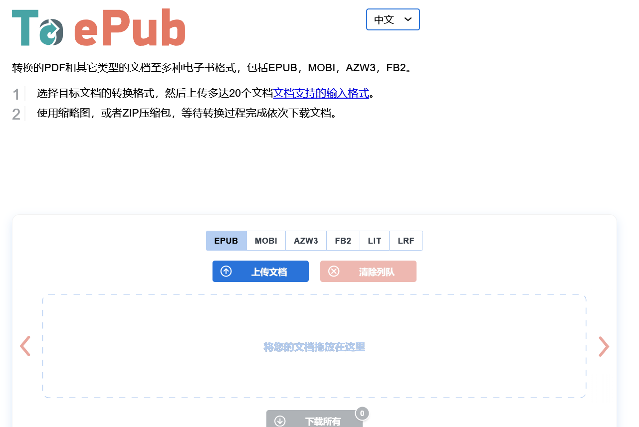 转换的PDF和其它类型的文档至多种电子书格式,包括EPUB,MOBI,AZW3,FB2。 选...