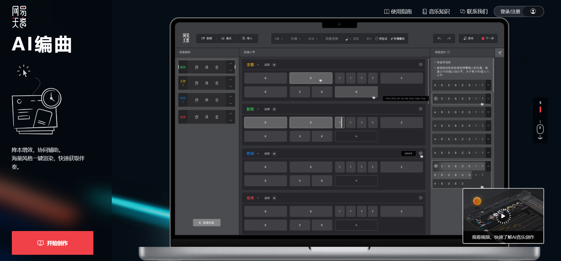 网易天音-AI音乐创作平台-官网;网易天音、天音、AI编曲、AI伴奏、音乐创作、编曲、伴奏、写歌、零基础写歌、网易、AI音乐、自动编曲、自动伴奏、人工智能、免费音乐、自学编曲网易天音2022全新AI创作平台正式上线,海量风格限时限免;一键渲染,点亮你的音乐天赋!