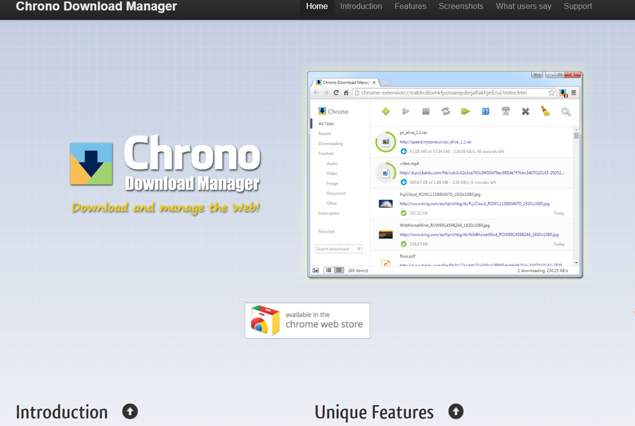 Chrono下载管理器是Chrome™浏览器下第一款也是唯一一款功能全面的下载管理工具。Chrono接管你在Chrome™中的所有下载,你的所有下载管理工作都在浏览器中完成,而不需要安装另外的程序。Chrono与Chrome™浏览器紧密地整合在一起,添加了对浏览器菜单、工具栏和快捷键的支持。