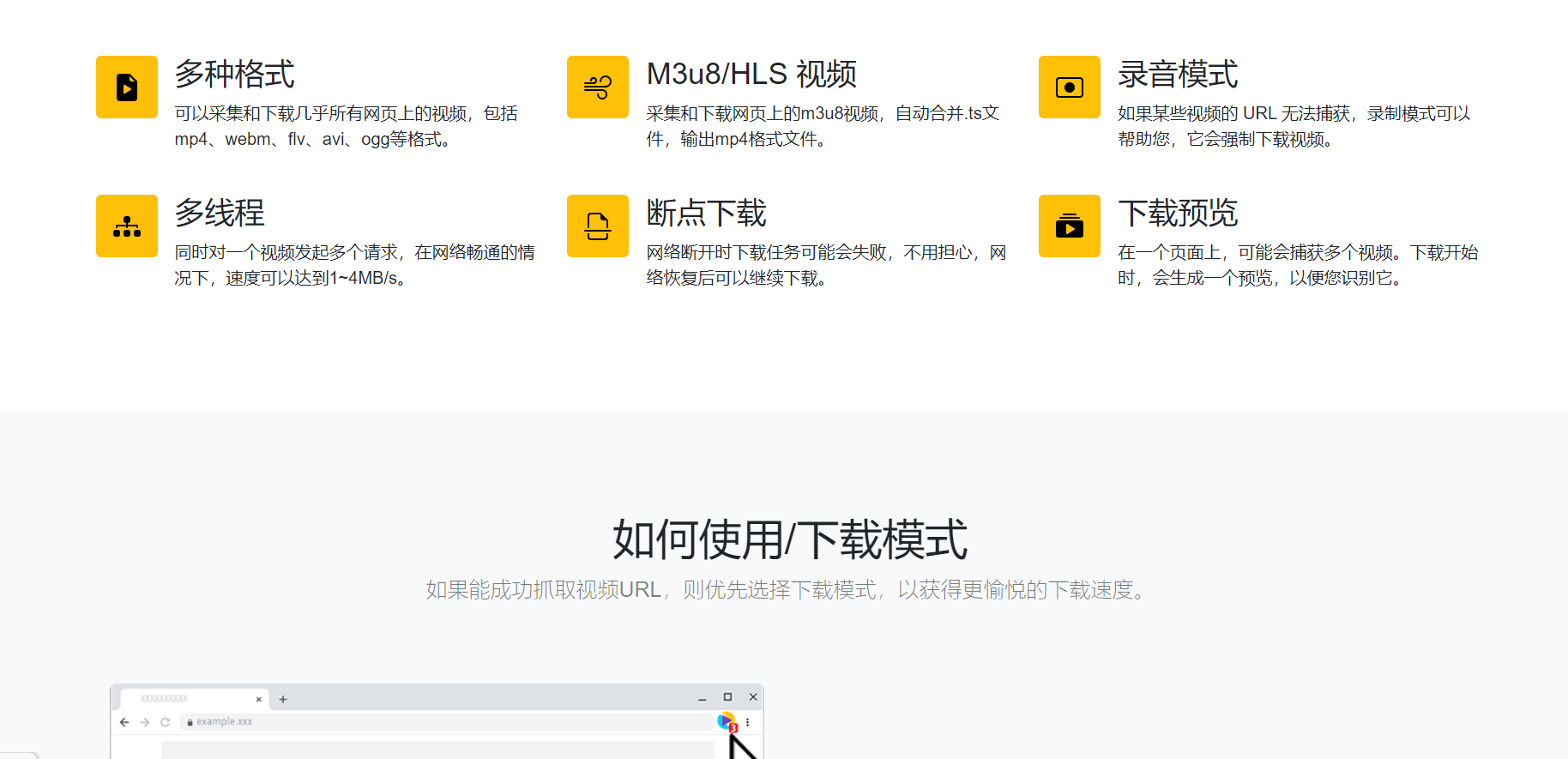 可以采集和下载几乎所有网页上的视频,包括mp4、webm、flv、avi、ogg等格式。
