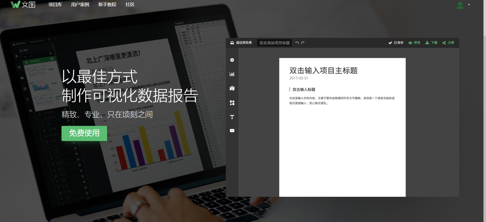 文图旨在为用户打造一个可在线编辑、即时生成数据报告的工具,预设有海量的模板和配色方案,可用作大数据分析可视化,业务报表生成,日常工作报告等等wentu,paperx,文图,图表制作,在线编辑,在线报告,大数据,可视化,echarts,visual,infographic