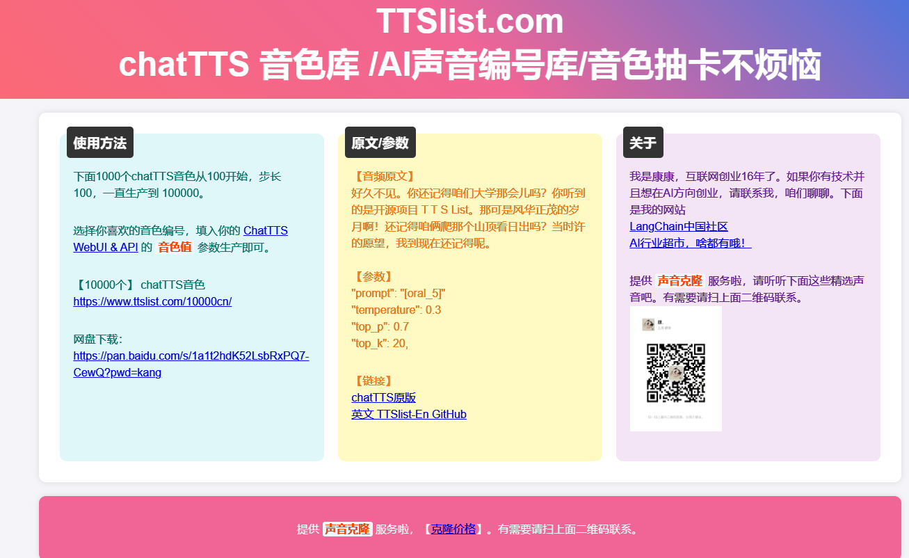 选择你喜欢的音色编号,填入你的 ChatTTS WebUI & API 的 音色值 参数生产即可。