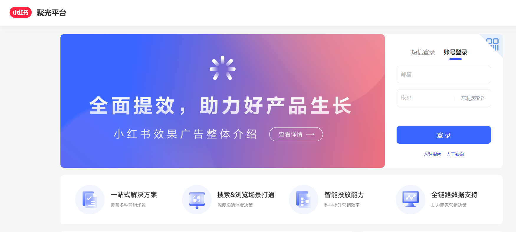 小红书推广,小红书广告,小红书营销,小红书商业化,广告投放平台,信息流广告,搜索广告,小红书蒲公英,小红书薯条。聚光平台是小红书营销的一站式广告投放平台,能够满足广告主以“产品种草、商品销量、客资收集、直播推广、抢占赛道”为目标的多样化营销诉求。平台打通了搜索和浏览两大用户关键决策场景,并支持以SPU(产品)为颗粒度的精准定向和智能投放能力,为广告主提供一体化的营销解决方案,让好产品自然发光。