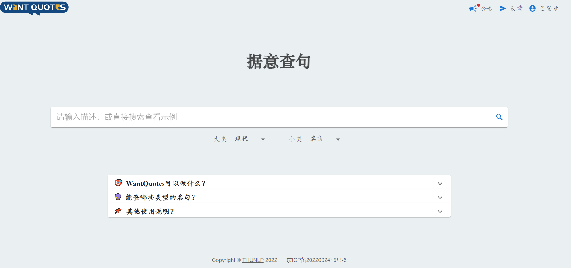 WantQuotes 据意查句WantQuotes;名言;名句;语录;谚语;歇后语;古诗词;俗语;熟语;惯用语;台词;语言;写作;清华大学;自然语言处理;汉语;Chinese;quotes;