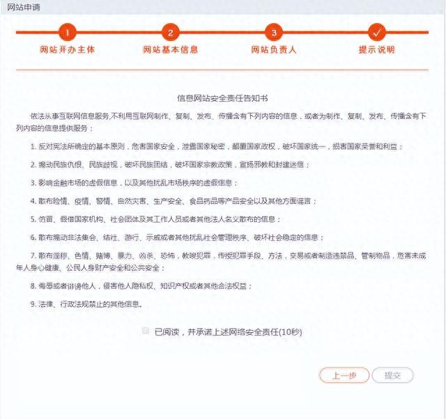 认真阅读《安全责任告知书》,勾选已阅读并点击提交,等待审核。需要注意的是非交互式网站审核完成后即完成备案,交互式网站需要进行面审或实地检查,具体情况请等待审核通知。