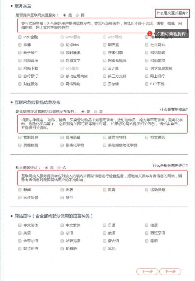 需要注意网站服务类型是否为交互式的选择,交互式服务指为互联网用户提供信息发布、交流互动等服务,包括但不限于论坛、网络购物、在线支付等服务类型。非交互式服务常见网站类型为单位门户网站,不涉及论坛、网络购物、在线支付等服务。