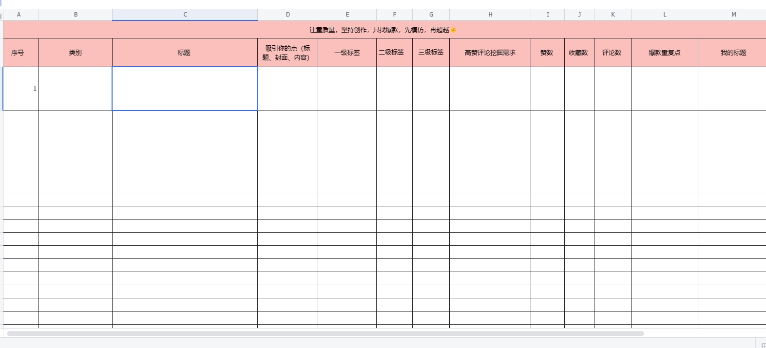 1、然后先上爆款选题库模版,表头主要由“标题”、“吸引你的点”、一至三级标签、赞、藏、评,小红书笔记链接构成。