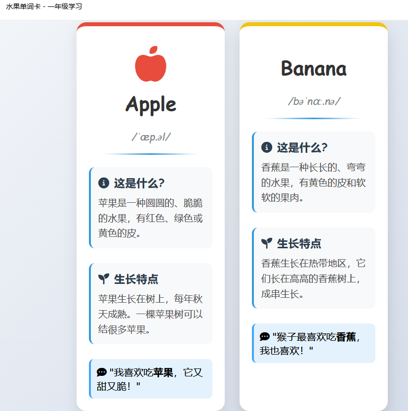 请帮我生成一个3个单词(apple、banana、strawberry)适合一年级小学生阅读的知识卡片,具体要求如下: