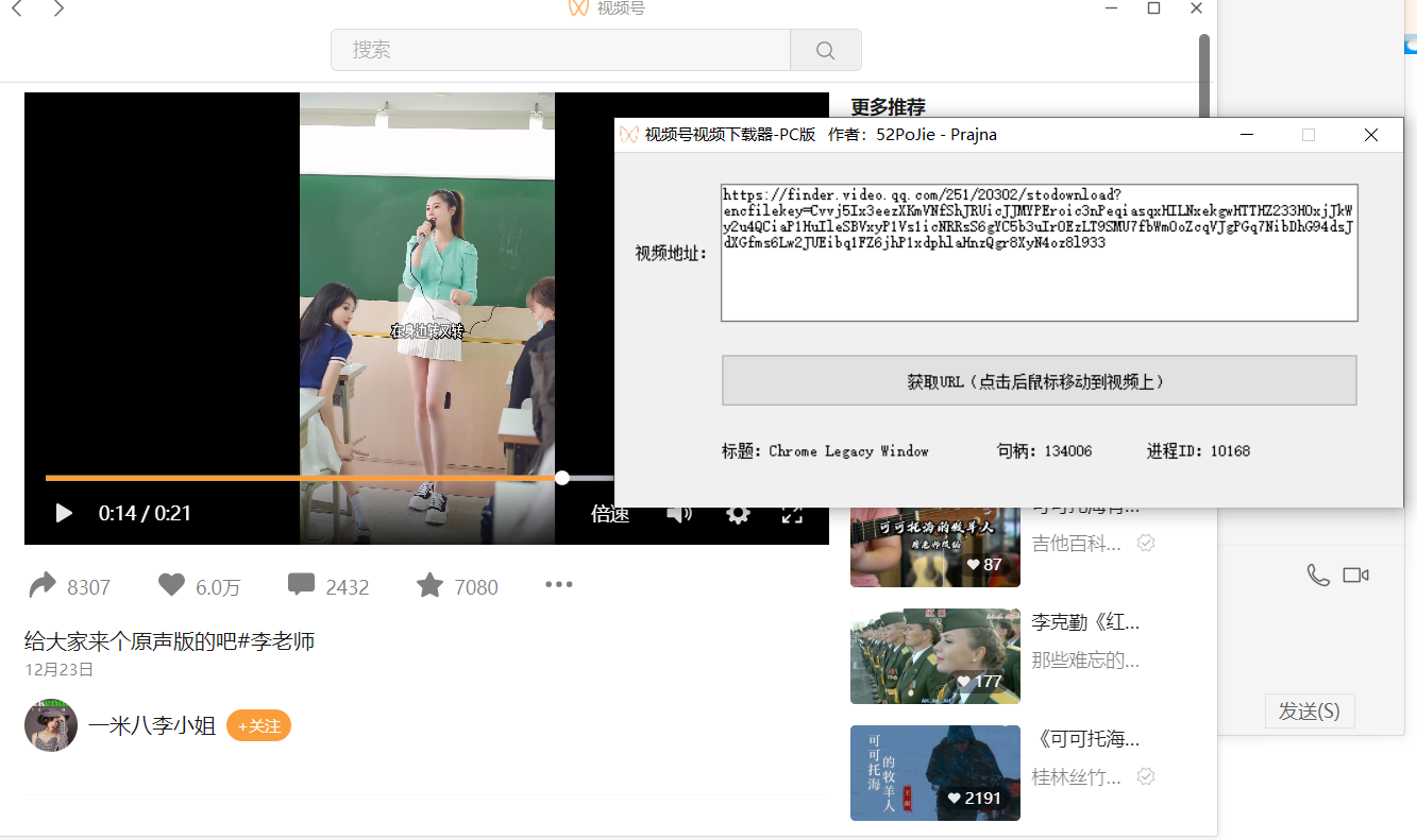 在电脑端微信聊天窗口中打开刚才转发过来的视频,接着打开下载工具,点击“获取URL”按钮,然后把鼠标移动到目标视频上即可,几秒之后软件就能获取到视频号里面视频的真实URL地址了。(很长的一串网址,可以不用理会,如果是虚拟机,最好微信电脑版和视频号下载器都是一个环境;)